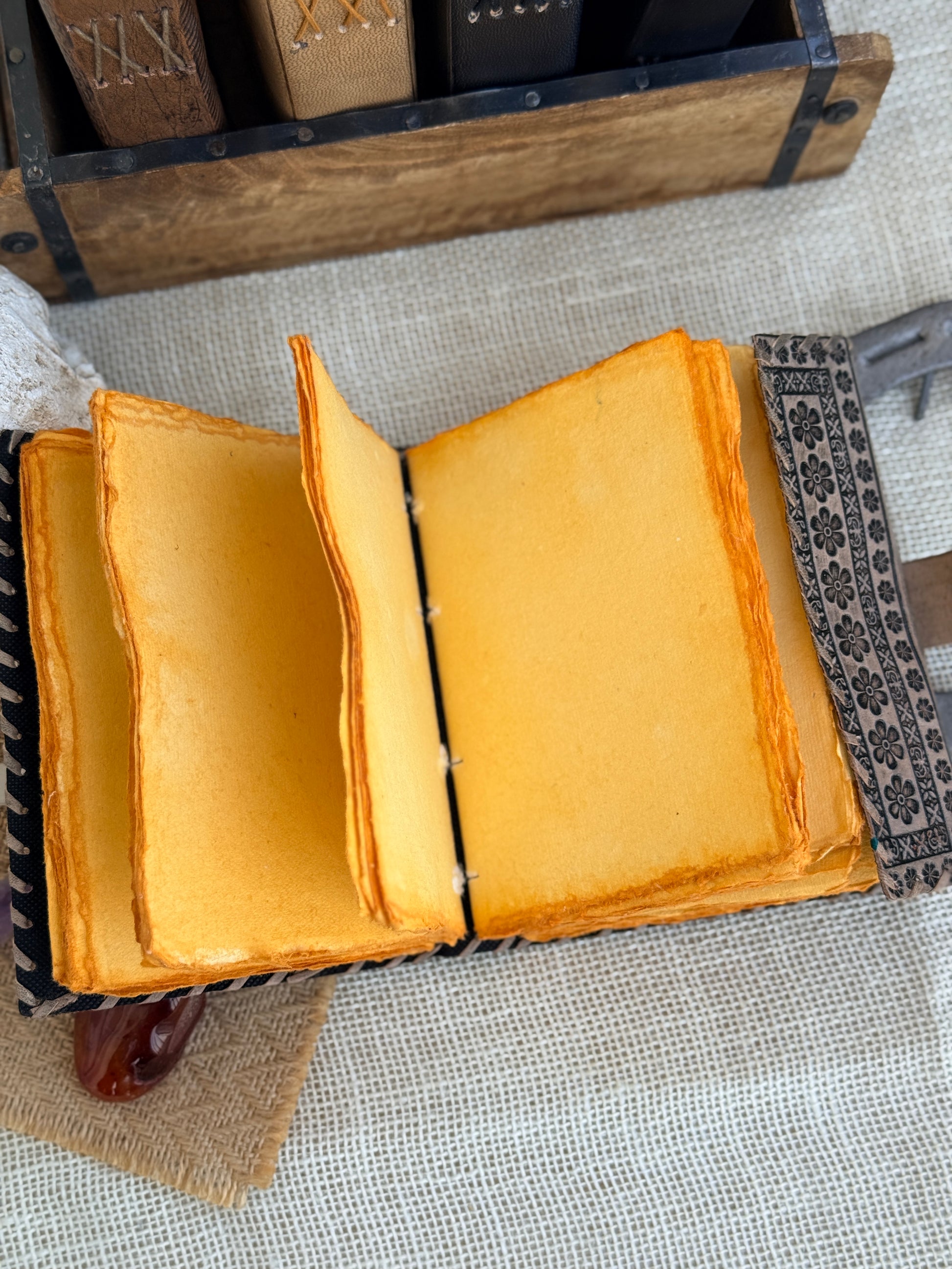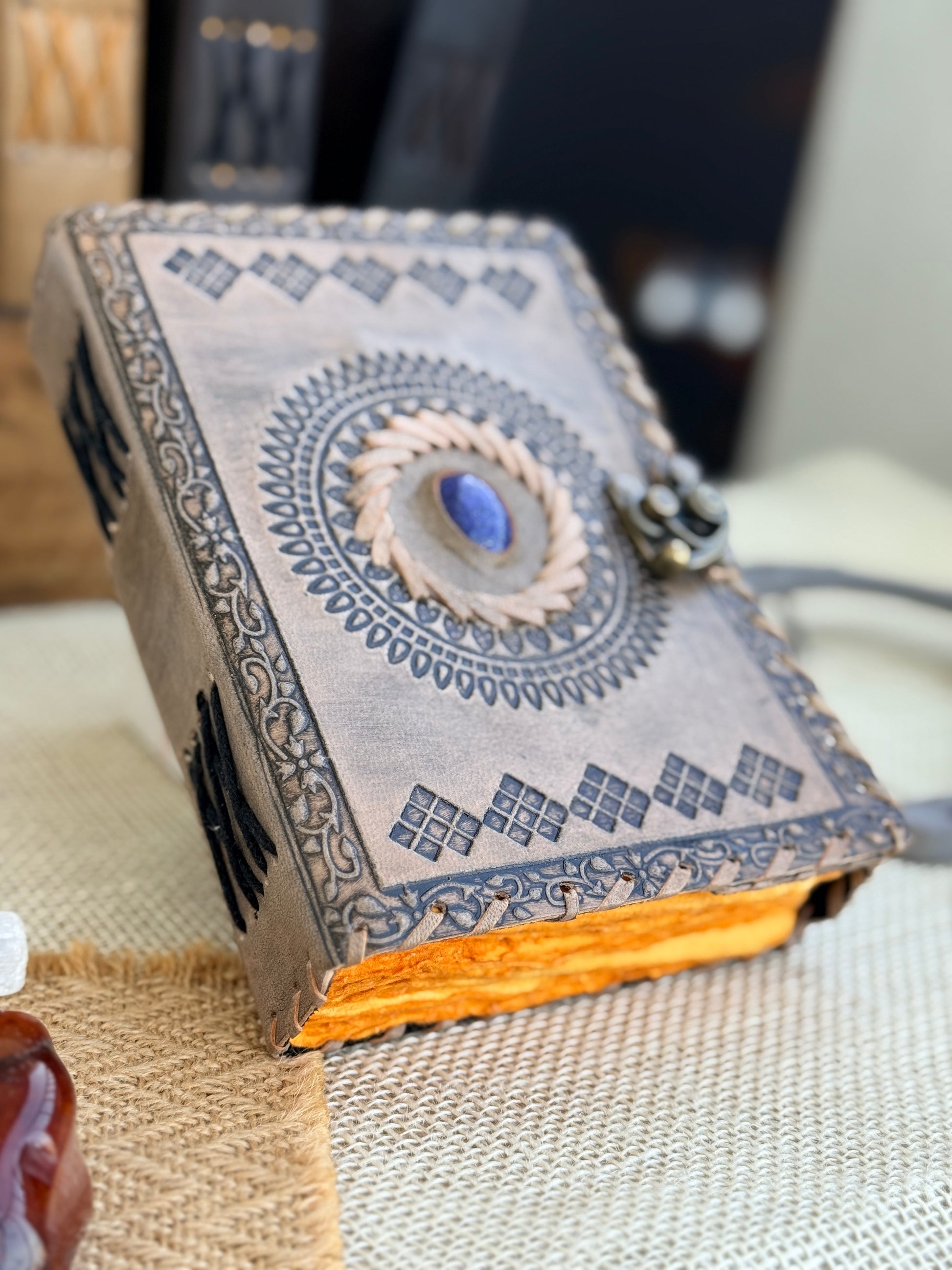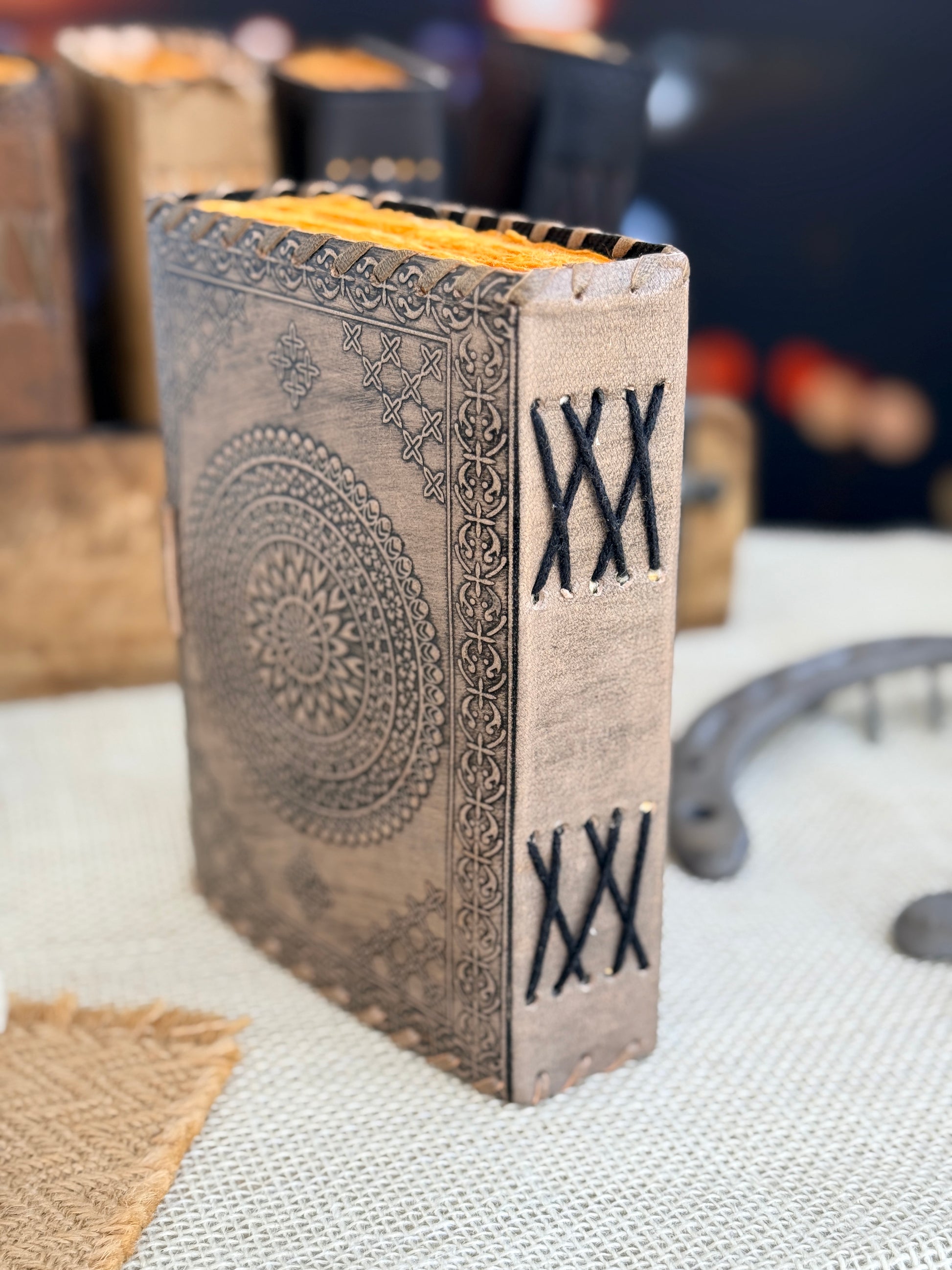 Zanurz się w świecie dawnych rytuałów i osobistych zapisków z naszą Księgą Cieni. Ten model to połączenie matematycznej precyzji wzorów z głębokim mistycyzmem. Wyróżnia się na tle pozostałych unikalną, chłodną kolorystyką oraz niezwykle bogatym tłoczeniem, które pokrywa niemal każdy centymetr okładki. To nie tylko notatnik, to artefakt stworzony dla tych, którzy szukają głębi i autentyczności w swojej magicznej praktyce. W środku znajduje się ręcznie robiony papier czerpany, który pięknie przyjmuje atrament i nadaje zapiskom wyjątkowy charakter.